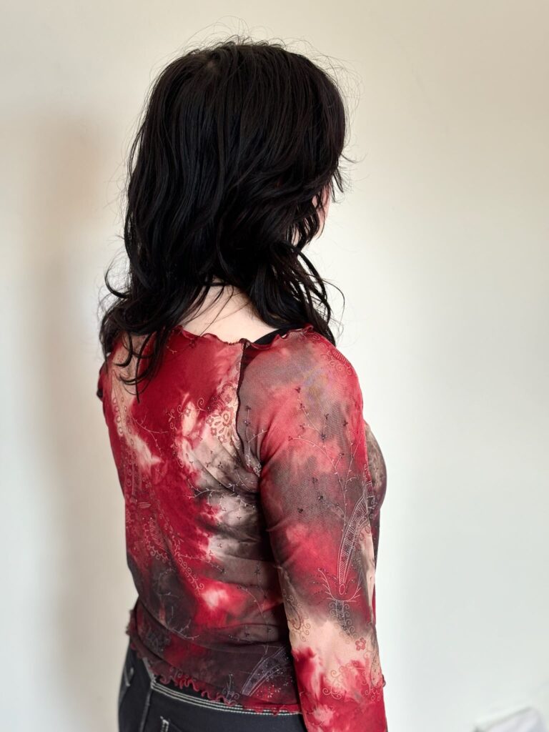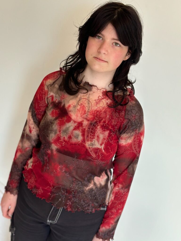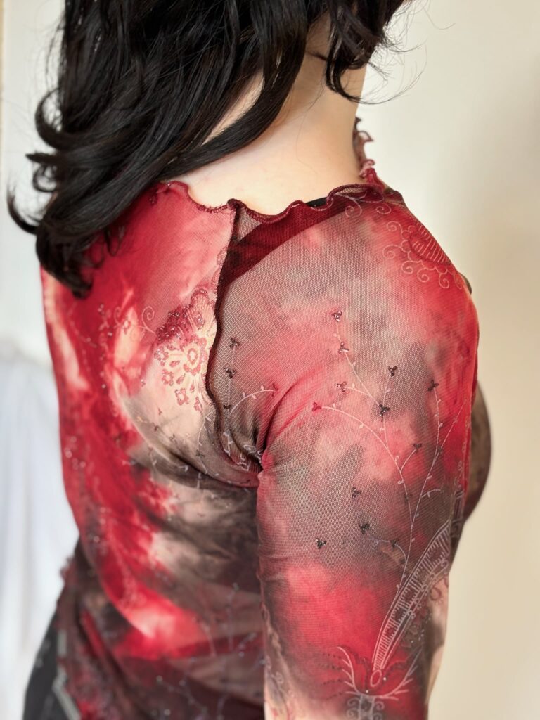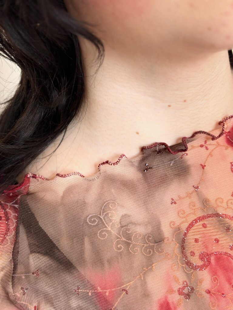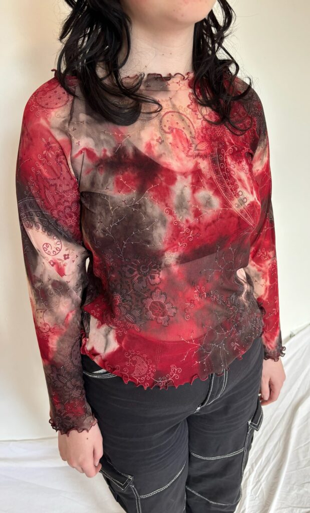 I made this top using a patterned mesh fabric gifted to me by my grandmother. I chose to create a lettuce hem on the collar, sleeves and hem as I wanted to experiment with using the technique. I also wanted to try creating a raglan sleeve top so I used a top I already owned as a reference when creating the pattern.