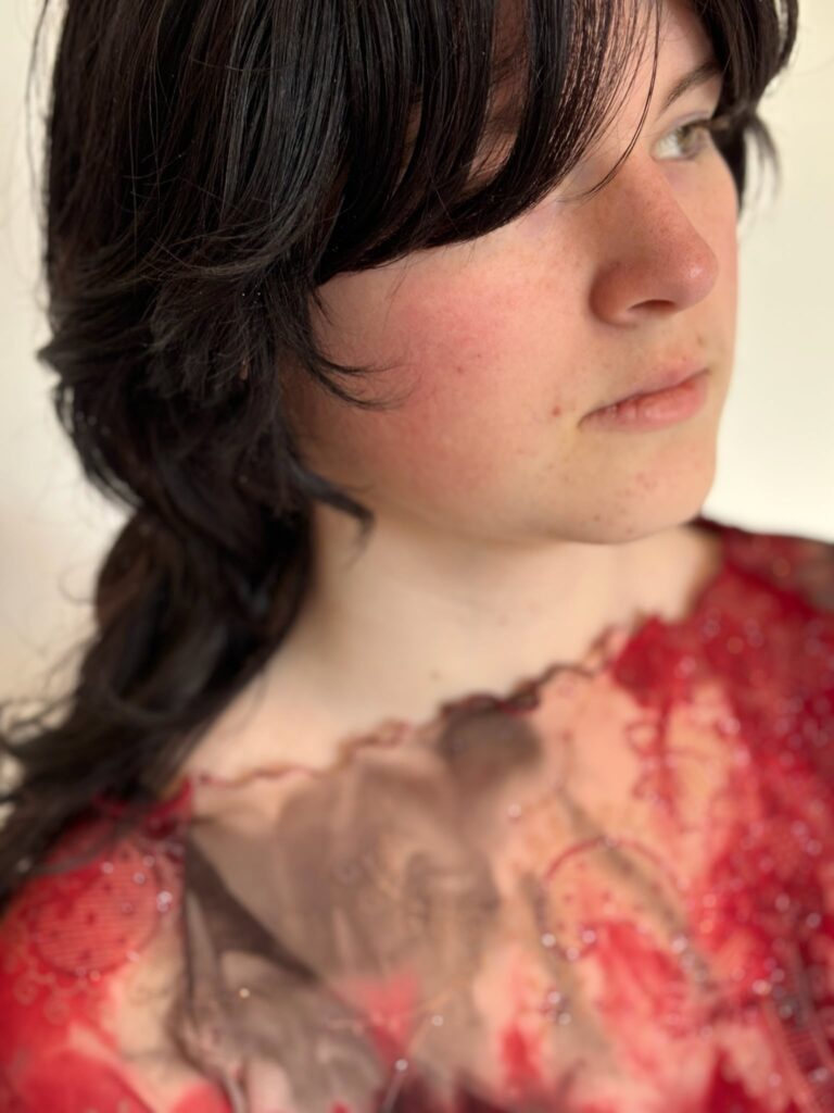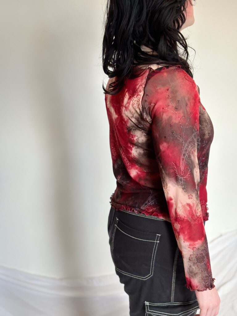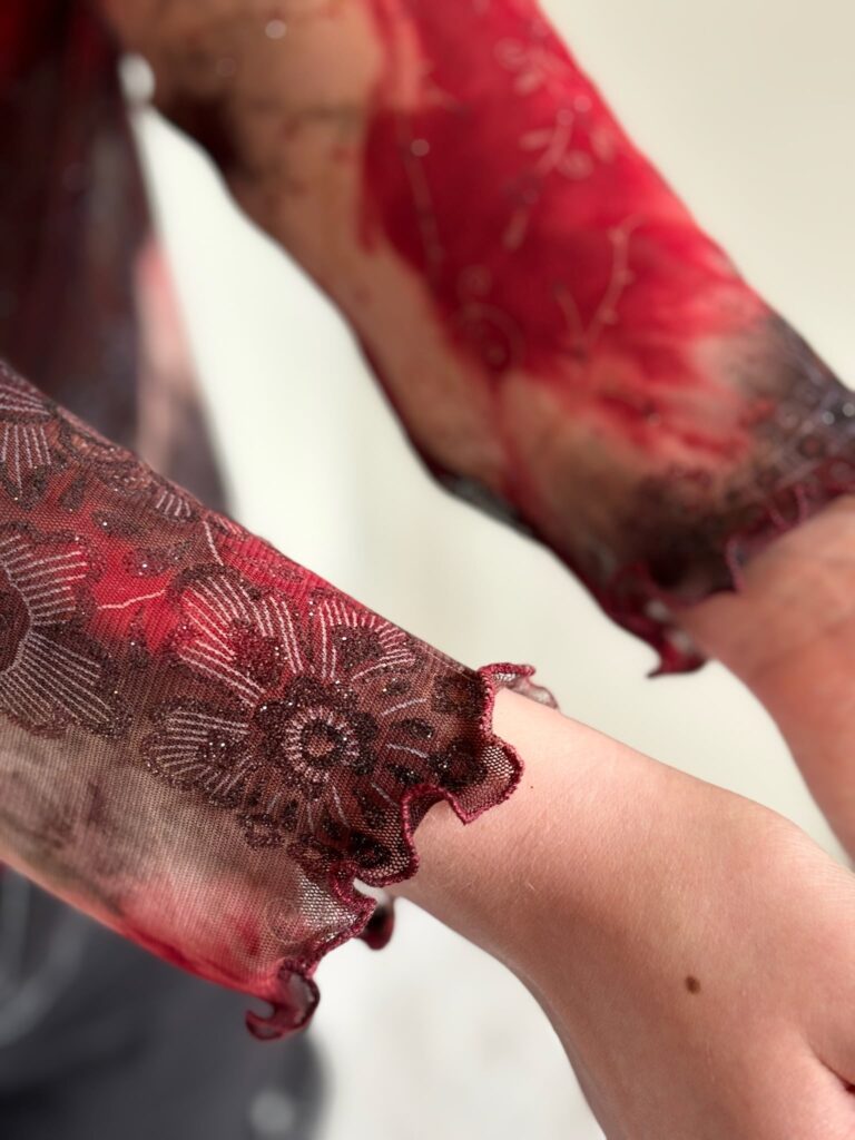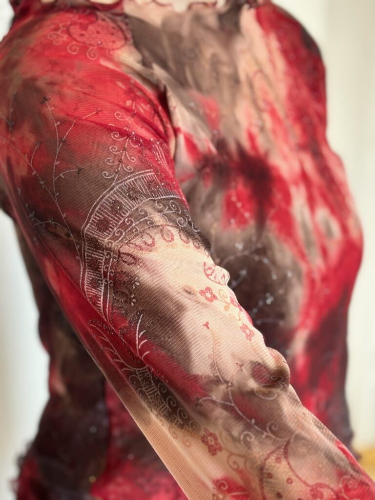 I made this top using a patterned mesh fabric gifted to me by my grandmother. I chose to create a lettuce hem on the collar, sleeves and hem as I wanted to experiment with using the technique. I also wanted to try creating a raglan sleeve top so I used a top I already owned as a reference when creating the pattern.