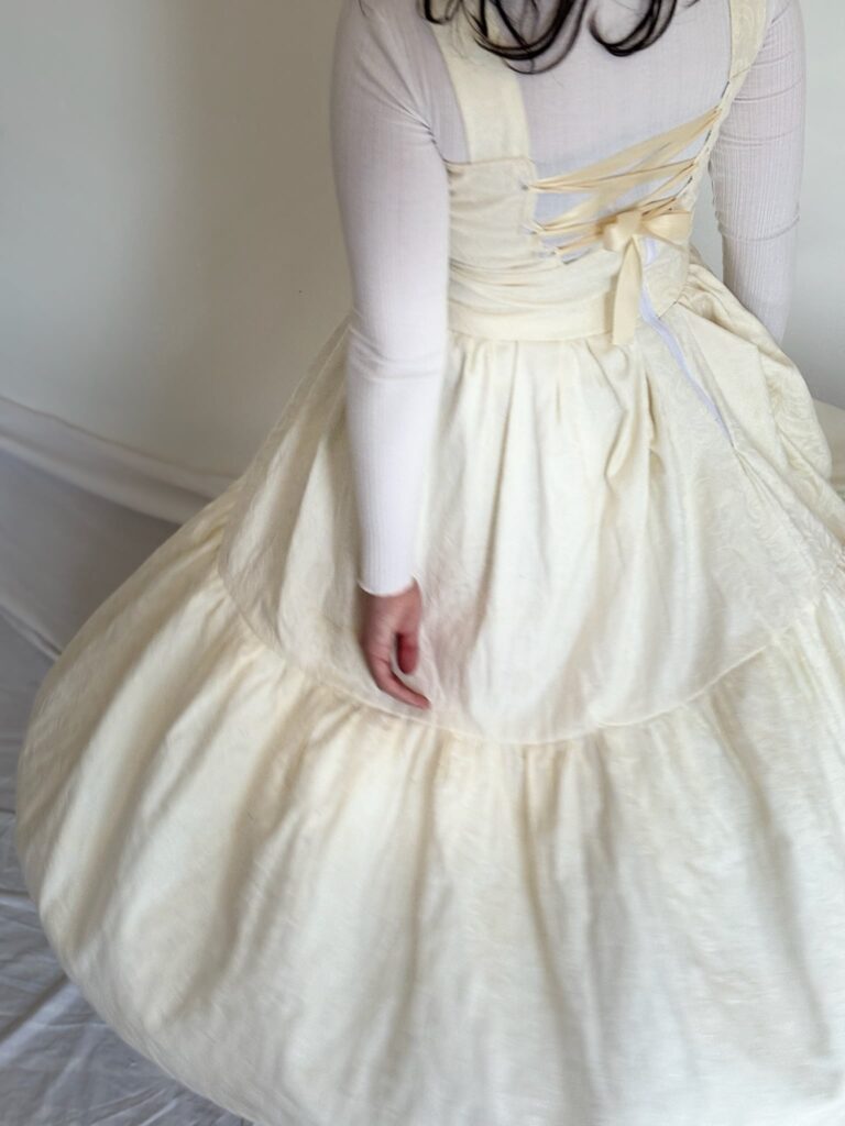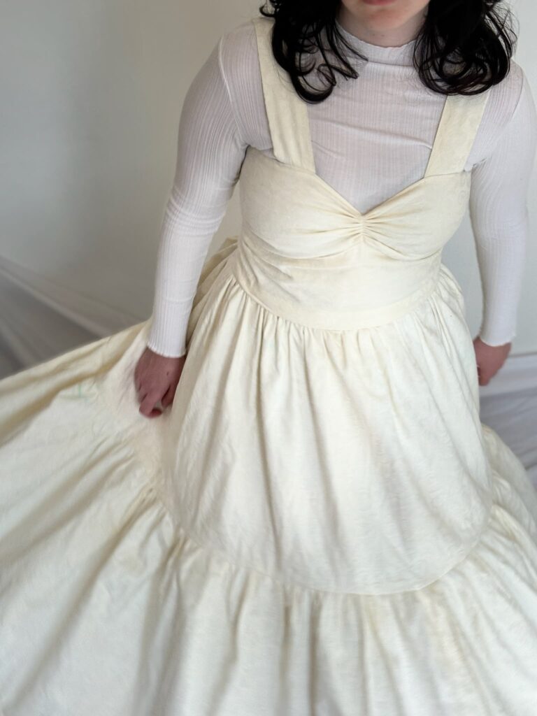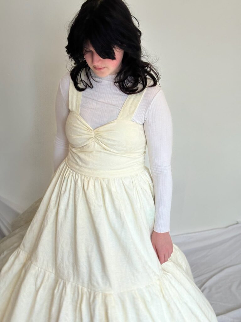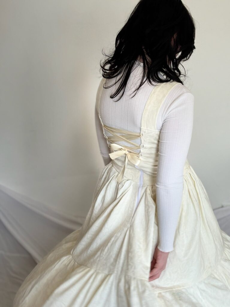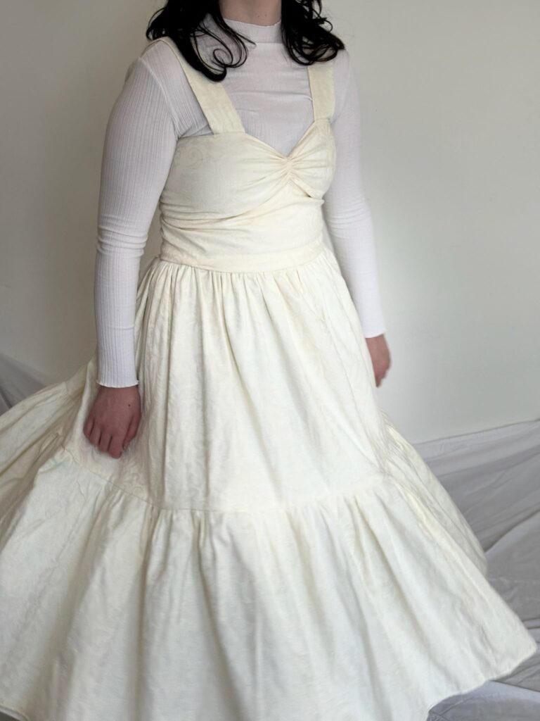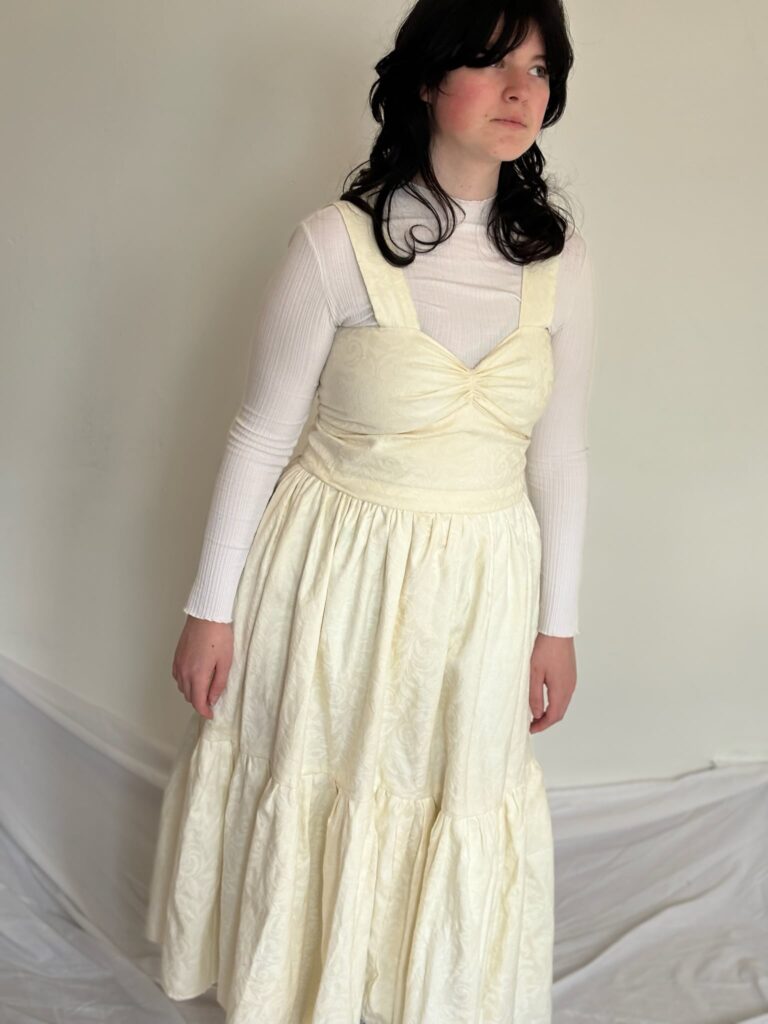 This dress was created as a project to repurpose old curtains. I was inspired by the floral details in the fabric to create a flow and elegant dress. I self drafted the pattern and this also was the first of three different dresses modifying the same pattern to experiment with different techniques and expand my sewing skills. The dress is fully lined in the bodice as well as the skirt, and I experimented using the button hole stitch on my sewing machine to create the lace up detail in the back.