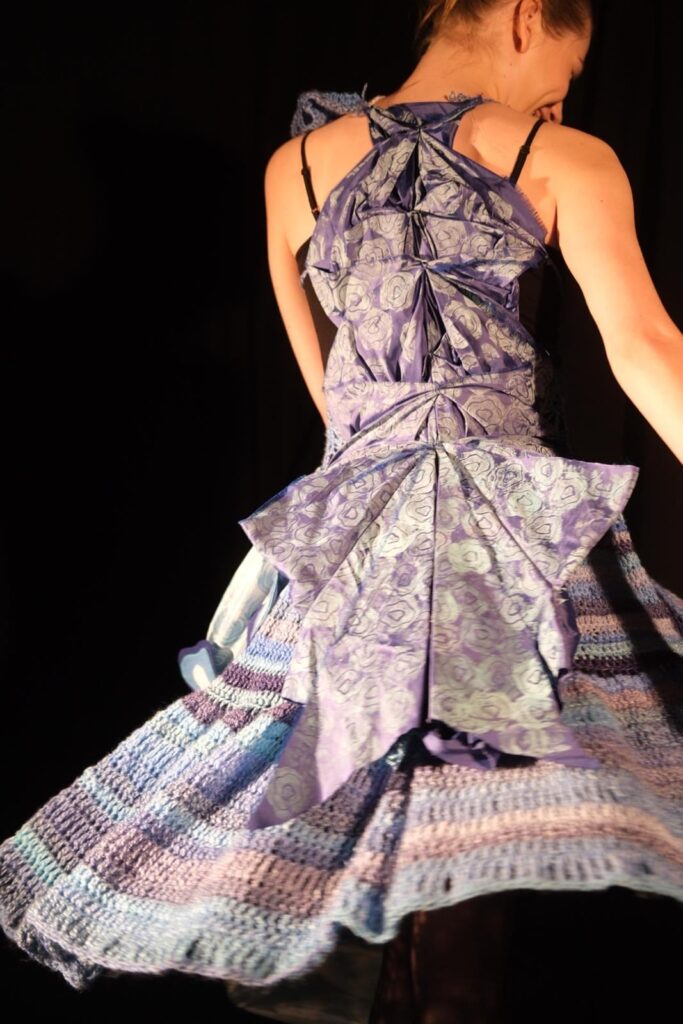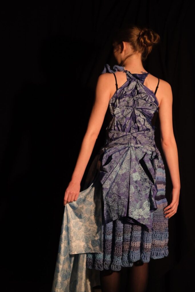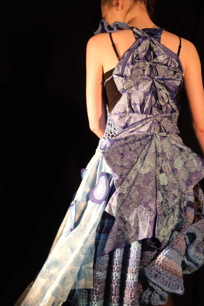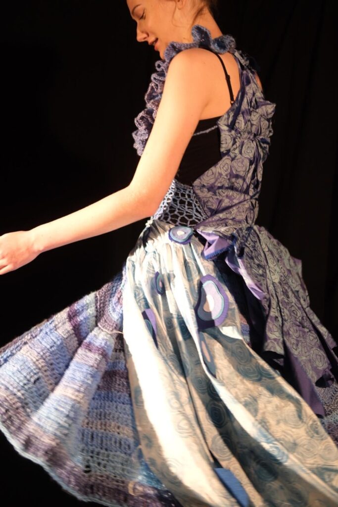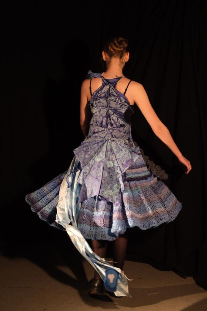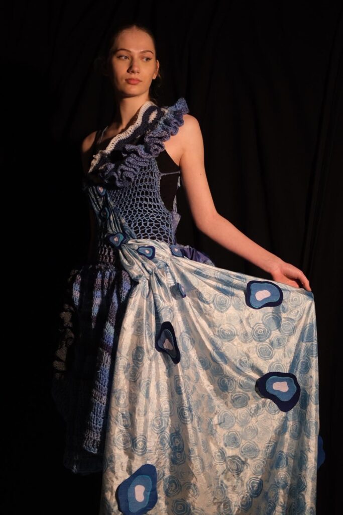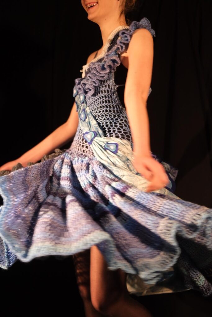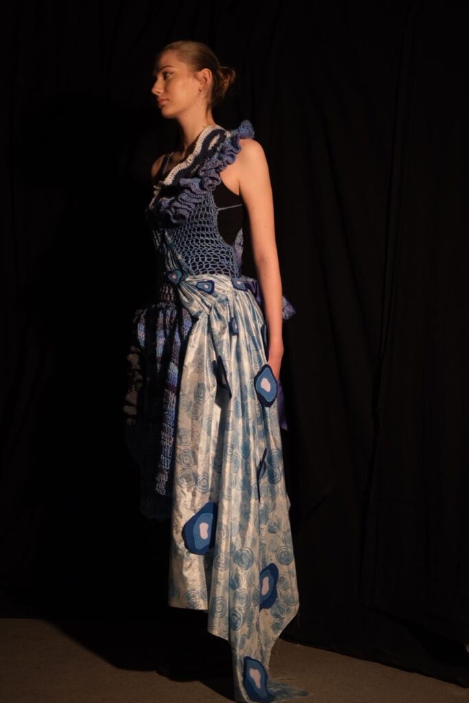 This dress was created for the design portfolio of my higher art qualification. I chose the theme of sharks as I found the shapes fascinating to develop and experiment with to inspire my design. I was particularly inspired by the shapes inside a sharks eye as well as their gills and the way they ripple through the water. I chose to use different shades of blue as my colour scheme for this design as I could tie in the oceanic theme as well as the natural colours found in some species of sharks in an expressive and interesting way. I began experimenting with different textile techniques such as crochet, knitting, and fabric manipulation. I also created a stamp using developed shapes from a sharks eye and used various paints and inks to create a patterned fabric myself. My final design was created with a mesh crochet bodice and a full crochet skirt with crochet ruffle and freehand crochet shapes at the top of the bodice. I also added the back detail of manipulated blue twill fabric which was then printed on using my handmade stamp and printing ink as well as silk fabric draped along the front and side of the dress which I also hand printed on using my stamp and blue watercolour paints. This design is one of my favourites so far and is the direction I see myself exploring further through my designs.
