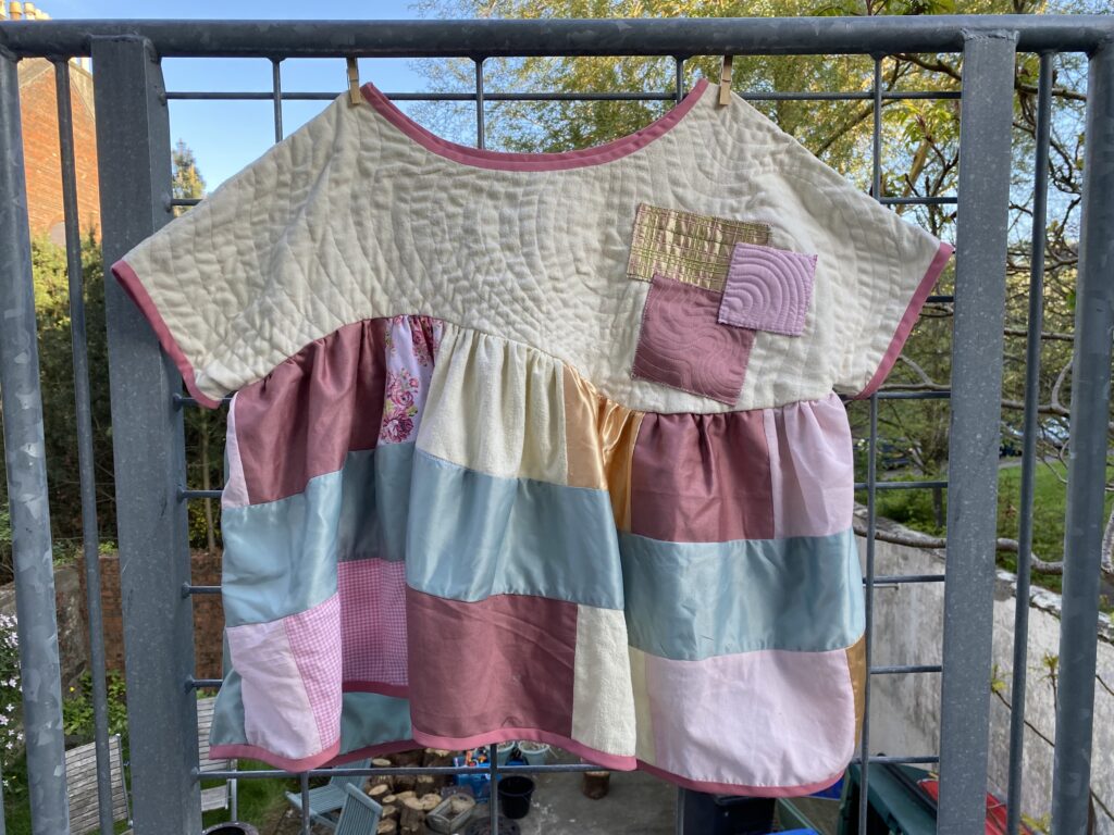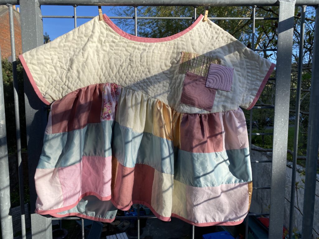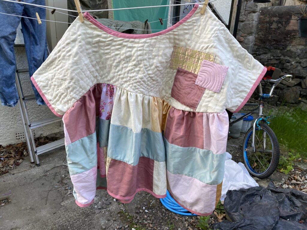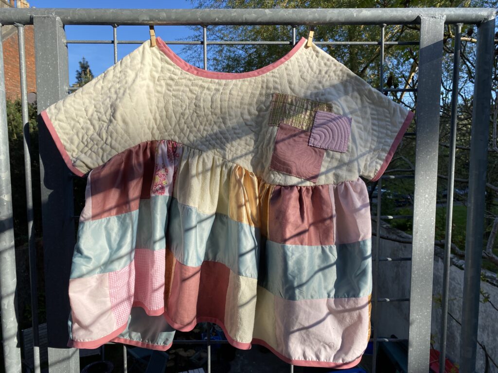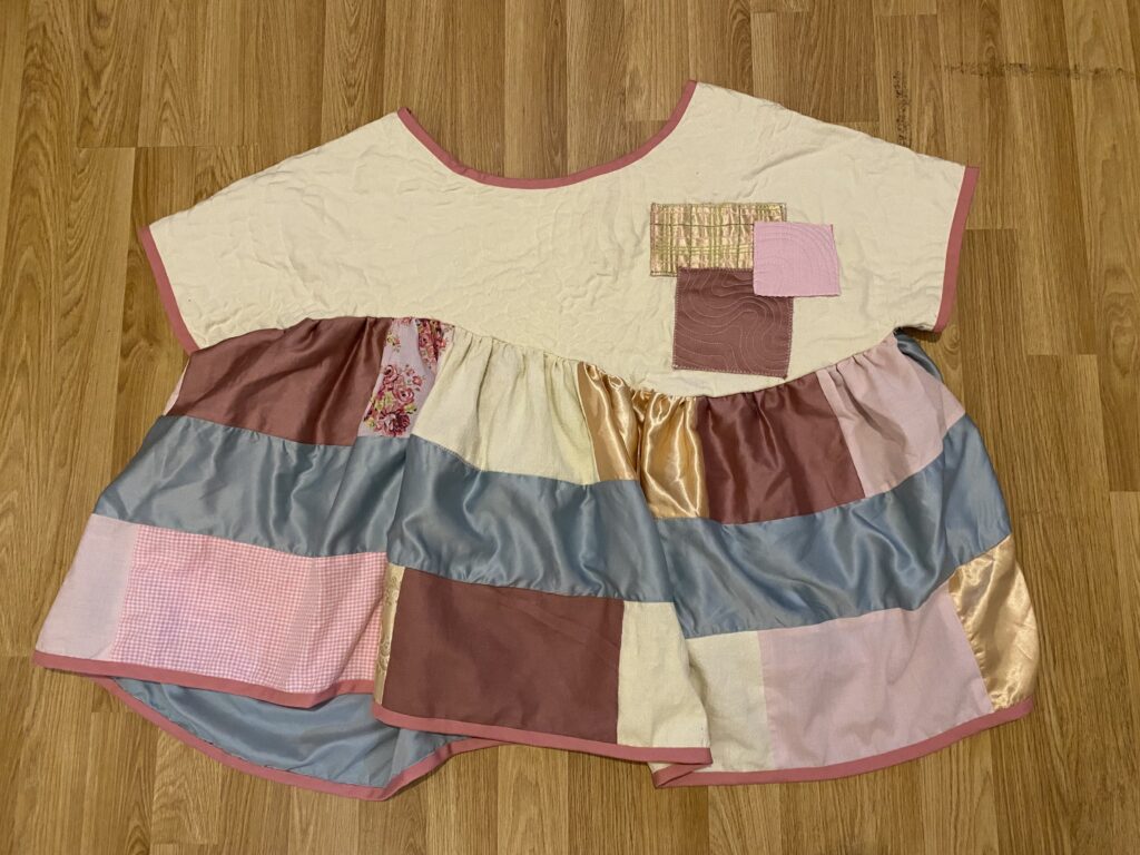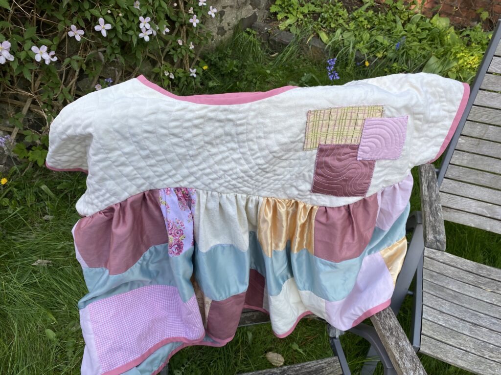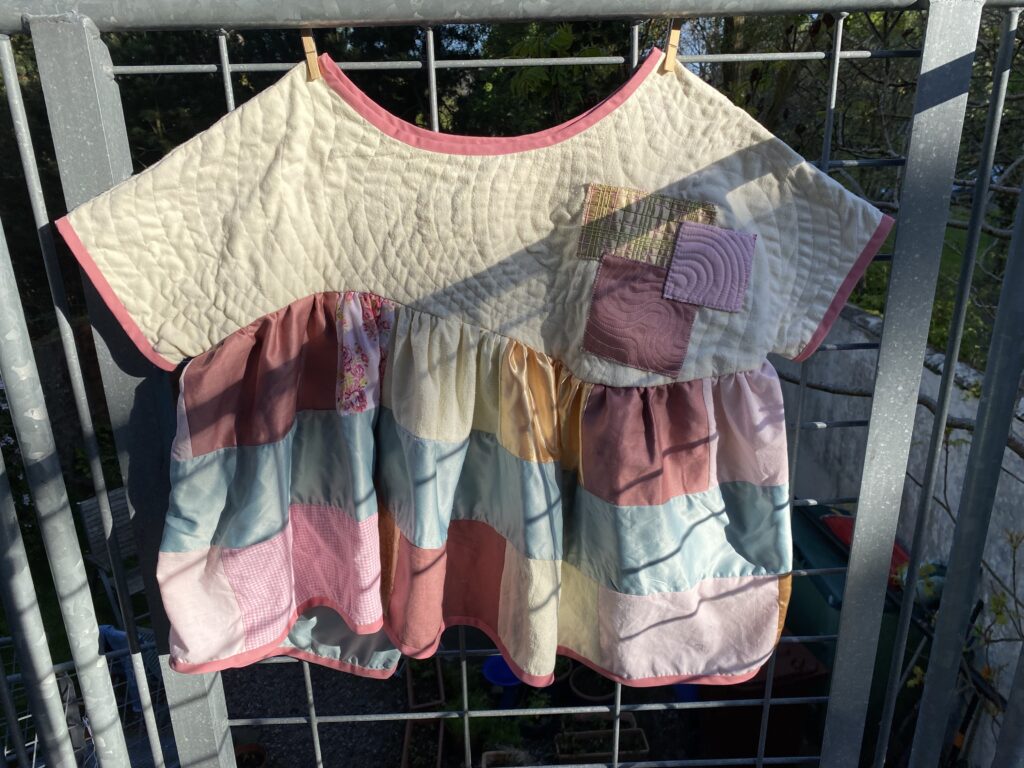 This patchwork top was created as part of a unit during my HNC textiles course. The task was to design a collection of patchwork tops and then create one final piece, reusing secondhand and unwanted fabrics or materials. The idea was to use sustainable methods of designing and creating to highlight the impact that fast fashion has had on the planet. Part of the project was to research patchwork designers as well as the traditional Japanese embroidery and mending methods of born and sashiko stitching to inspire our designs. I was inspired by the quilt designer Russell Barratt and the clothing designer David Black/ House of Black who both use secondhand clothing and fabrics to create their designs. I used a range of secondhand clothing, old bedsheets and scrap fabrics to create my design and was inspired by spring time flowers which I explored through my colour pallette of pastel pinks, yellows and greens.