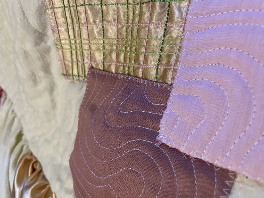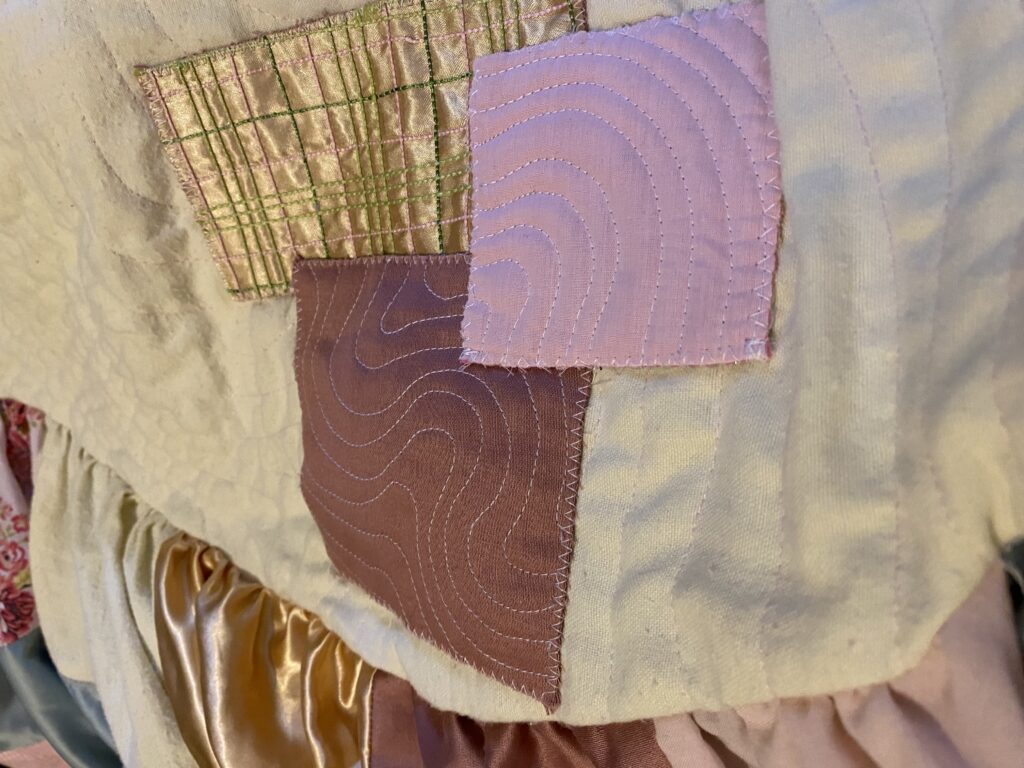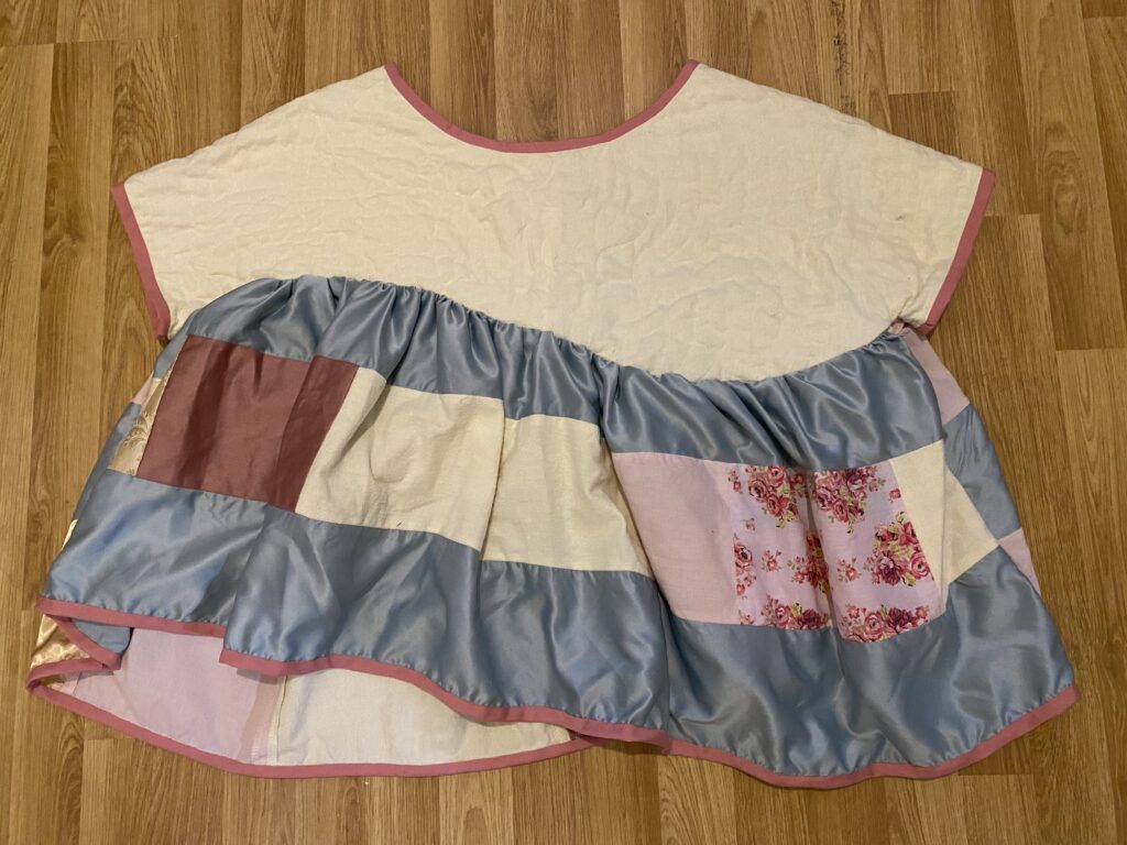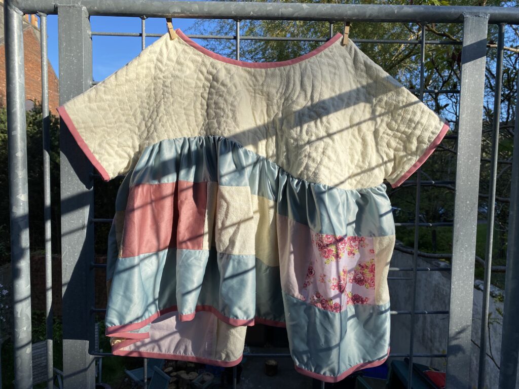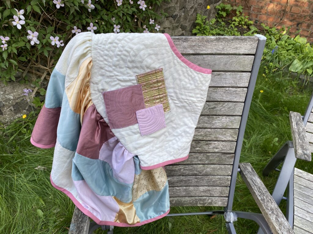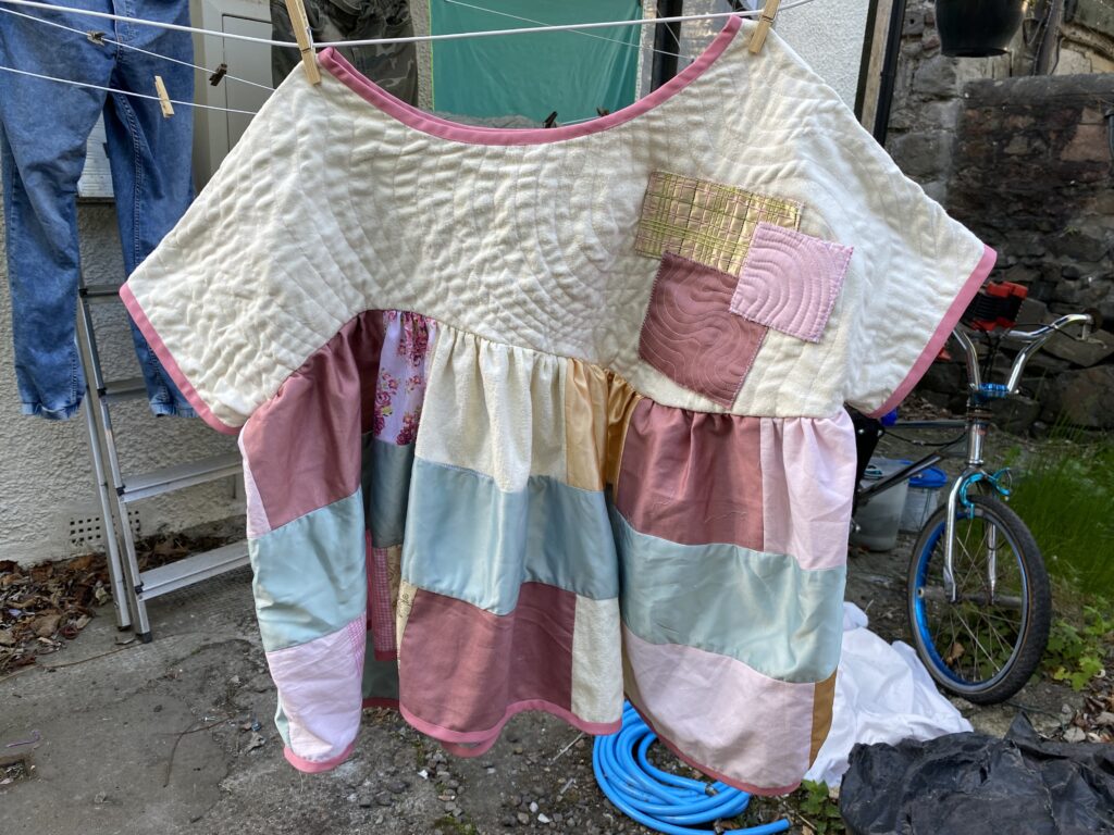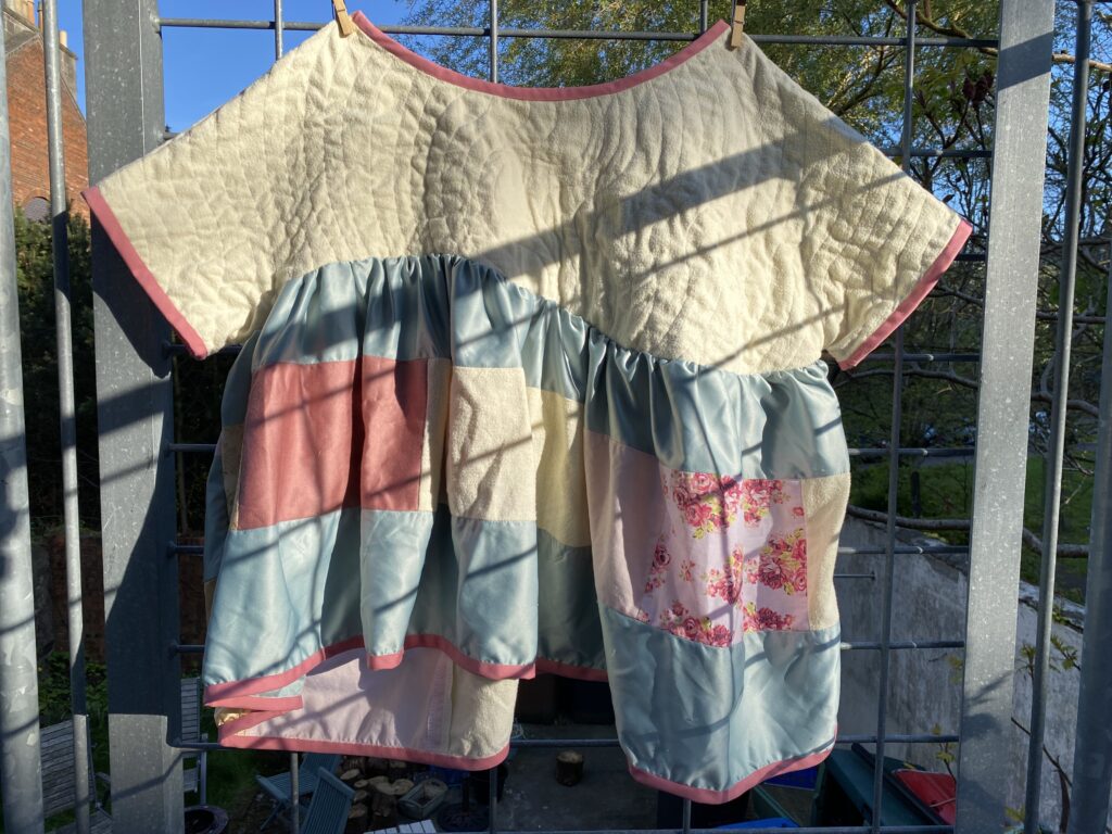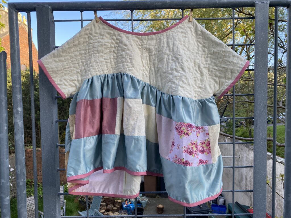 This patchwork top was created as part of a unit during my HNC textiles course. The task was to design a collection of patchwork tops and then create one final piece, reusing secondhand and unwanted fabrics or materials. The idea was to use sustainable methods of designing and creating to highlight the impact that fast fashion has had on the planet. Part of the project was to research patchwork designers as well as the traditional Japanese embroidery and mending methods of born and sashiko stitching to inspire our designs. I was inspired by the quilt designer Russell Barratt and the clothing designer David Black/ House of Black who both use secondhand clothing and fabrics to create their designs. I used a range of secondhand clothing, old bedsheets and scrap fabrics to create my design and was inspired by spring time flowers which I explored through my colour pallette of pastel pinks, yellows and greens.